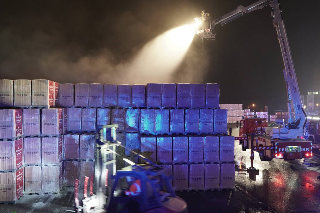 Das komplexe Einsatzbild erforderte jedoch, dass die Ziegelpaletten mithilfe von Gabelstaplern vom Lagerplatz entfernt und einzeln abgelöscht bzw. gekühlt werden mussten. Währenddessen kühlte die FF Vösendorf mithilfe des Hubsteigers die aufgestapelten Paletten von oben. Laufend wurde die Temperatur der Paletten mittels Wärmebildkamera kontrolliert.