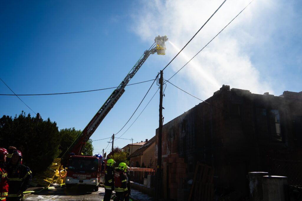 Am Einsatzort bot sich den Einsatzkräften ein ausgedehnter Brand von unterschiedlichen Dämmmaterialien sowie ein fortgeschrittener Brand auf der Dachfläche des Hauses, Personen waren zu diesem Zeitpunkt zum Glück keine mehr auf dem Dach. Um eine möglich schnelle Eindämmung des Brandes zu gewährleisten und ein Übergreifen zu verhindern, wurde umgehend mit der Schnellangriffsleitung der erste Löschangriff durchgeführt. Parallel dazu wurden zwei weitere Löschleitung und die Versorgungsleitung aufgebaut. Einer der zwei eingesetzten Atemschutztrupp begann sofort mit den Löscharbeiten des Dämmmaterials im Außenbereich, der zweite fokussierte den Löschangriff auf die Dachhaut des Hauses. Ein weiterer Atemschutztrupp der Feuerwehr Maria Lanzendorf bereitete eine dritte Löschleitung für den Innenangriff vor, zum Glück hat sich das Feuer jedoch nicht in den Innenbereich ausgedehnt. Nach nur wenigen Minuten zeigten sich bereits erste Löscherfolge.